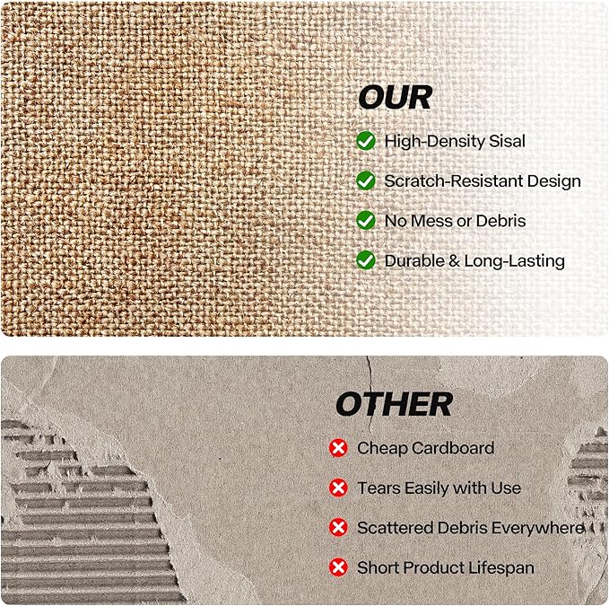 - 🌿 Natural Sisal Scratching Pad & Wooden Base – Made with 100% natural sisal cat scratcher material and durable pine wood, this cat scratching board is more long-lasting than a cat cardboard scratcher, providing a stable scratch pad for cats that promotes healthy claws and safe playtime.