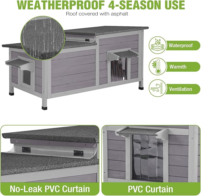 - Easy to Clean: Equipped with the removable floors and two large opening roofs, the cat shelter allows for easy cleaning of the interior. The roof PVC curtain effectively prevents rainwater from seeping in, keeping the interior dry. The plastic feet cover design prevents ground moisture from affecting the structure of the cat shelter.