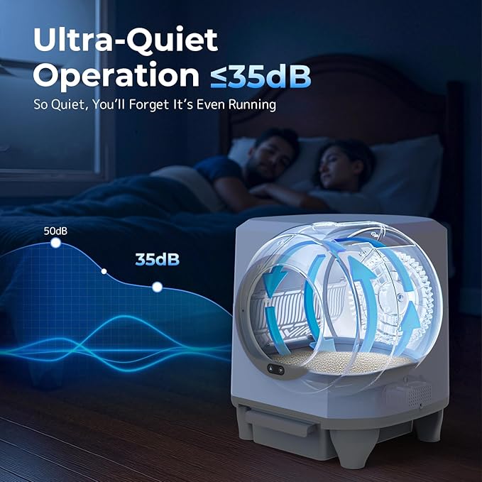 - Ultra-Quiet Automatic Litter Box:Engineered for ultra-quiet operation, this automatic cat litter box runs at under 35 decibels—quieter than a whisper—so it won’t disturb you or your cat, even during nighttime use. Perfect for bedrooms and small apartments.