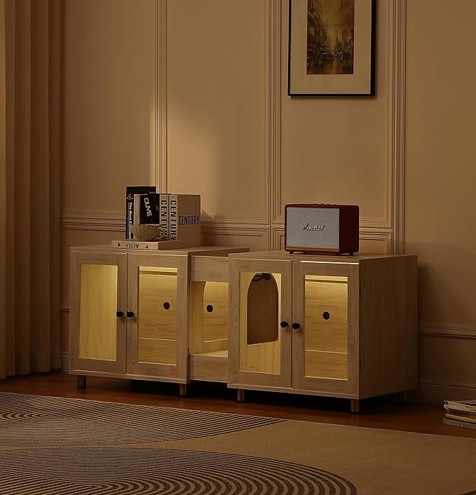 - 【Dual-Section Litter Box Enclosure】Designed for multi-cat households, this innovative enclosure features two separate litter compartments with a central entryway,allowing two cats to use it simultaneously without crowding.The smart divided layout ensures hygiene and reduces territorial stress.