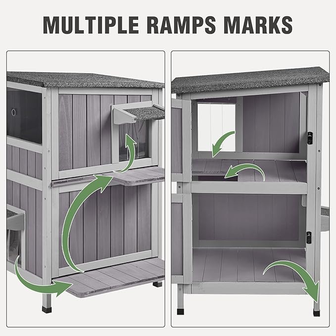 - Two-Story Cat Condo: This two-story cat condo provides your beloved cat with a comfortable, safe, and stylish outdoor living space. It features a sturdy wooden structure with a waterproof asphalt roof, ensuring your cat stays dry and warm in any weather conditions.