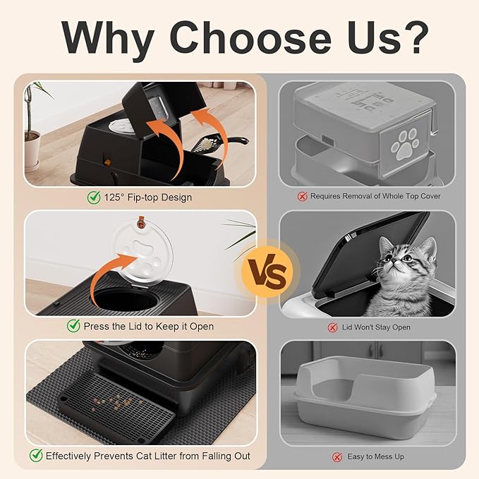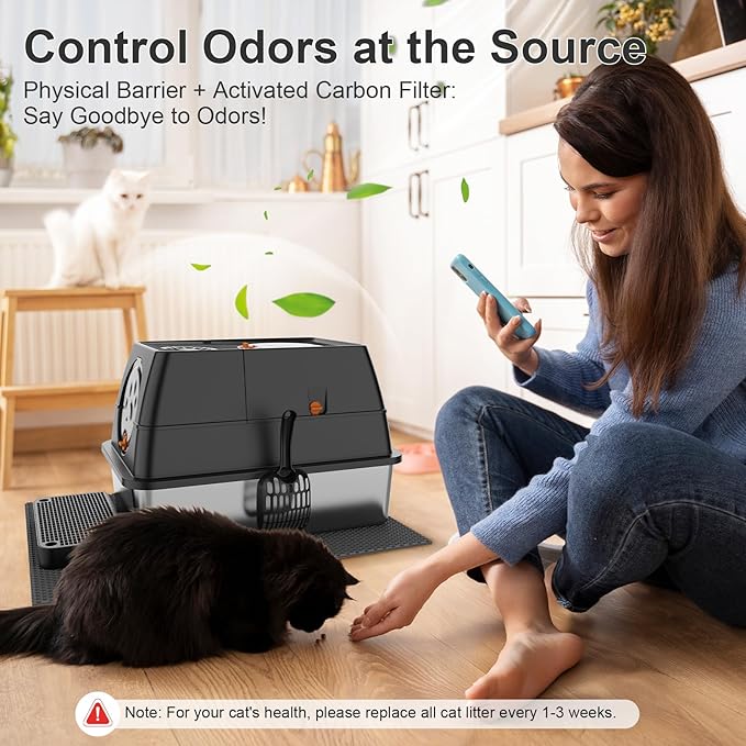 Stainless Steel Cat Litter Box with Lid, XL Extra Large Kitty Litter Box, Enclosed Top Entry Metal Litterbox for Big Cat, Easy Cleaning, Anti-Leakage & High Sided with Mat, Aisle & Scoop Black