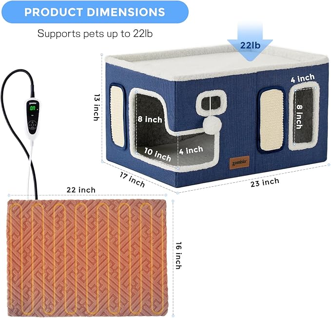 - Timed Temperature Control: The cat house with heating pad features a timer and temperature control function, allowing you to adjust the settings according to your pet’s needs. The timer has 24 settings plus 1 continuous mode, and there are 11 temperature levels (80°F to 130°F) to choose from.