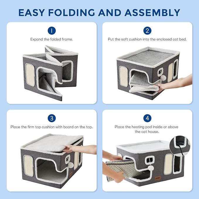 - Comfort and Warmth: Our heated cathouse provides even warmth, helping your pet stay comfortable in cold weather. This is especially important for older pets, those with arthritis, or young pets. In addition to offering warmth, the heating pad can also help your pet relax. It is an effective aid for pregnant pets or those recovering from surgery.