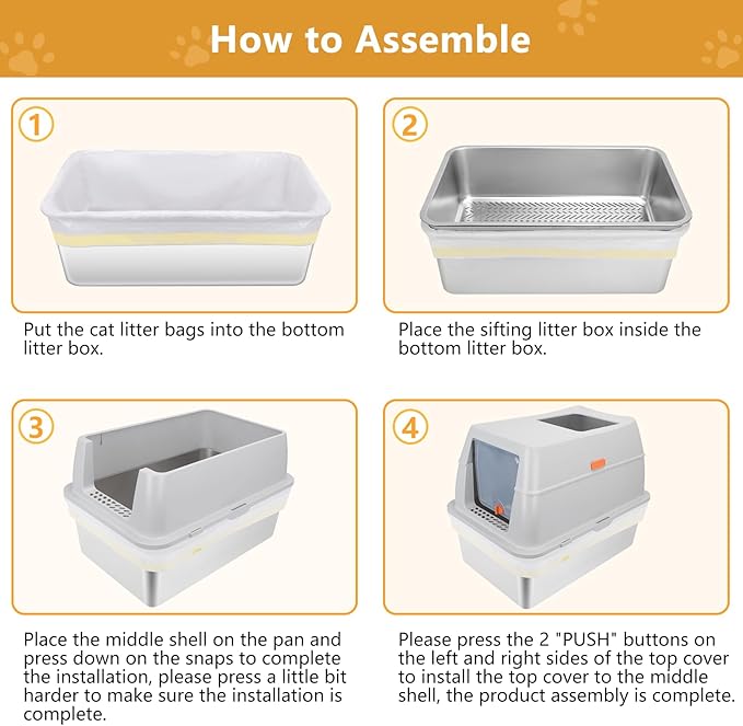 - 【Premium Stainless Steel & Odor Control】The stainless steel cat litter box is made of high-quality materials,built to withstand up to 5 years of use without losing its shape.The litter box pan is made of stainless steel, making clean a breeze compared to plastic litter boxes. Metal litter boxes do not retain odors or stick to waste, and boasts excellent durability, scratch resistance, odor resistance, stain resistance, and rust prevention.Beside,It also features a deodorizing compartment for placing bamboo charcoal bags to absorb smells quickly.