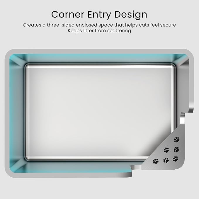 - Corner Entrance - Enhanced Security & Superior Containment: Designed with a corner-positioned entry, this steel cat litter box forms a enclosed three-sided space, ensuring your cat feels safe and secure. The wrap-around design effectively prevents urine spray and minimizes litter scatter, maintaining a cleaner home