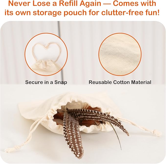 - 6.After‑Sales Care & Support Refills ship nestled together to minimize plastic waste—feathers may bend slightly in transit. To restore them, dip in warm water (122 °F+) for 10 seconds and gently reshape.Thank you for your understanding in protecting our planet! If you have any concerns, please feel free to reach out, we’re here to help you and your cat every step of the way.