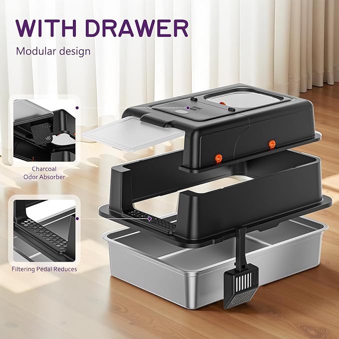 Stainless Steel Litter Box with Lid, 28" XXXL Large Cat Litter Box Enclosure for Multiple Cats, Odor Control with Carbon Filters, Anti-Leak High Sided, Includes Removable Lid & Scoop, Black