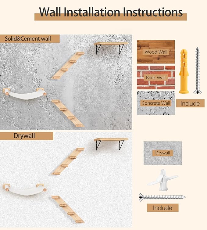 - Cat Wall Shelves Set of 4 – Cat Wall Shelves with 1 Floating Fabric Hammock, 2 Cat Wall Ladders with 4 Steps Each & 1 Flat Cat Shelf – Wall Mounted Cat Bed Furniture & Climber for Large Cats, Indoor Wall Cat Playground