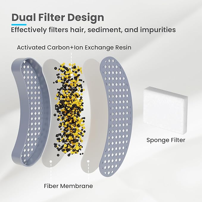 - Advanced Filtration System: The kitty spout fountain includes activated carbon and sponge filters that effectively remove dust, hair, and bad taste, ensuring fresh and clean water from this cat fountain your pet will love.