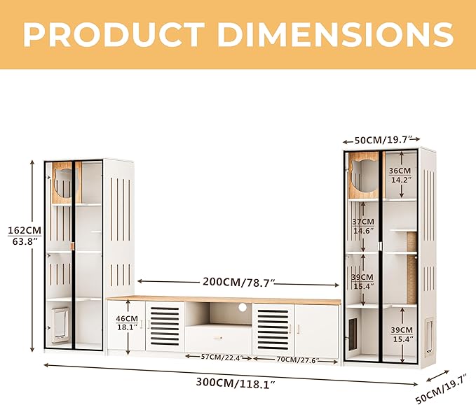 - Premium TV Stand – Functional & Versatile: The 78.7-inch wood TV stand anchors the setup, supporting flat-screens up to 85 inches (200 lb capacity). Designed for practicality, it features two enclosed storage cabinets (perfect for hiding cat supplies or household items), a convenient drawer, and open shelving to organize media devices, books, or decor—keeping everything tidy yet easily accessible.