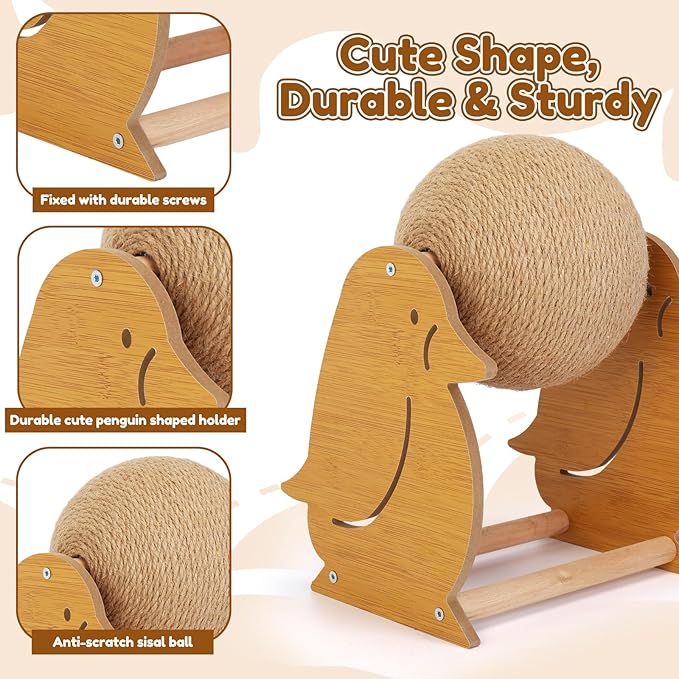 - Durable Cat Ball Toy - The cat scratcher ball toy is composed of sisal scratching ball and cute penguin shaped stand, fixed with durable screws, the sisal playing ball is anti-scratch, for long time use.