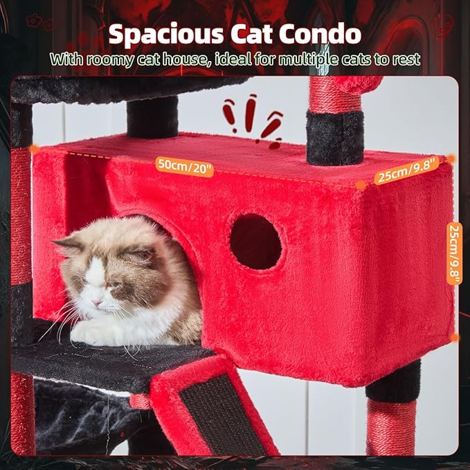- All-in-one design: There are 5 floors with 2 soft tops, 1 spacious cat apartment, 1 sisal ramp, 1 hammock and 1 hanging basket, natural sisal scratching posts and skin-friendly plush, and a multi-functional cat tree that attracts cats to play and rest.