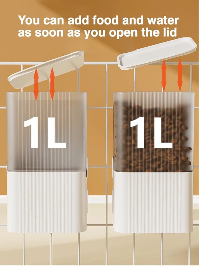 - 【 Safe and easy to Use 】: The pet food trough and 1L water container are made of food-grade plastic, which is non-toxic and odorless. The transparent container design makes it very convenient to observe the remaining food and water. Once the lid is opened, food and water can be filled without disassembling the entire device, allowing for easy replenishment of food and water