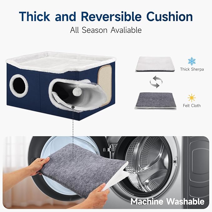 Cat Beds for Indoor Cats, Extra Wide Cat Cube House for Multi Cats, Foldable Cat Cave Hideaway with Arc-Edge Design & Oval Door, Double-Side Soft Cushion for All Seasons, 24"L x 17.7"D x 12.6"H, Blue