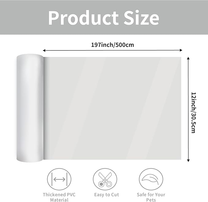 - Almost Invisible - The 12in x 197in anti cat scratch furniture protector offers transparency, blending seamlessly with furniture. This cat scratch deterrent for furniture preserves the original look of décor while protecting against cat scratches. Maintain the beauty of sofas, chairs, tables, and other surfaces without compromising on protection. The clear design ensures it remains unnoticed while safeguarding cat supplies, kitten supplies, and cat products.