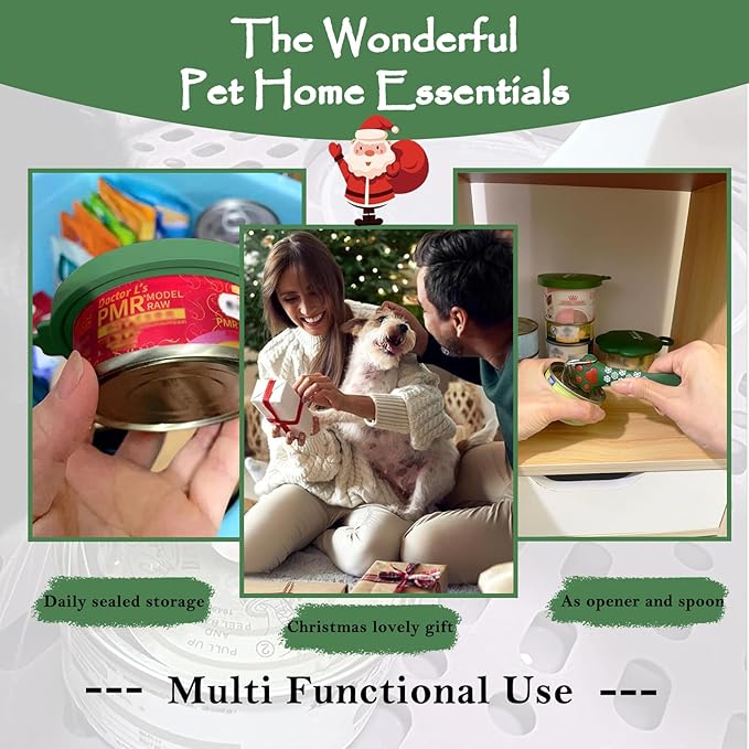 Christmas Pet Set - 3 Cat Food Can Lids & 1 BPA-Free Can Opener | Cute Paw Shape Opener Spatula Spoon for Wet Food | Silicone Spoon & Covers for Dog Cat - Christmas Green