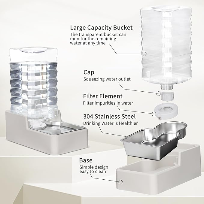 - Gravity Feed & Automatic Refilling: The efficient gravity-feed design ensures that the stainless steel bowl automatically refills to the optimal water level as your pet drinks. This prevents spills, and the proper water level also allows your pet to drink in a more comfortable position. With continuous hydration without the need for daily refills, you'll never have to worry about your pet running out of water while you're away.