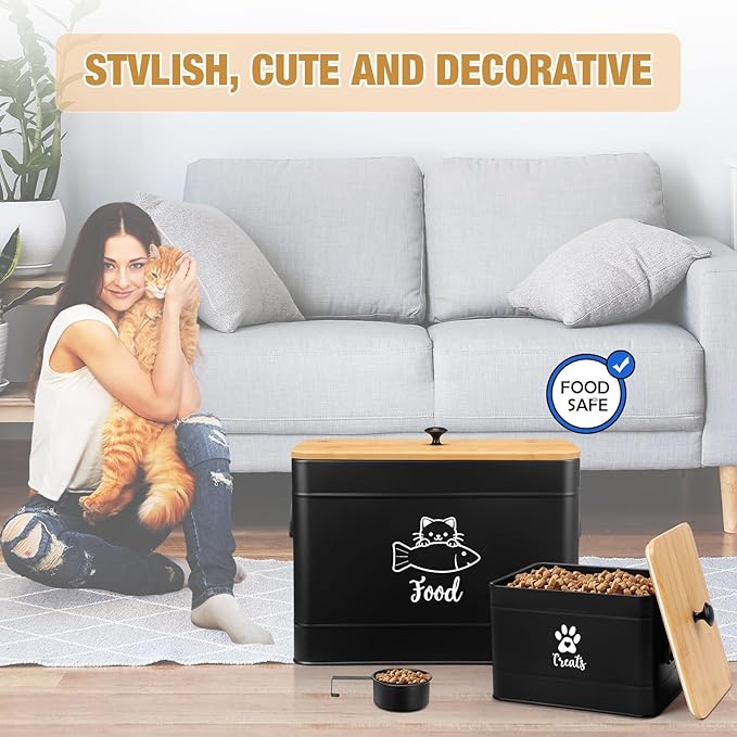 Extra Large Metal Cat Food Containers Airtight 12+3.5 lbs Cat Treat Snack Jars Set of 2 with Bamboo Lids and Spoons Farmhouse Big Pet Cookie Storage Jars for Kitchen Counter Gifts(Black)