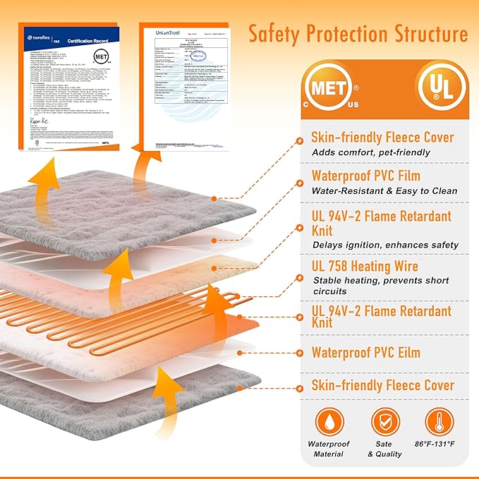 - Layered Safety Protection: Built with a 7-layer protective structure and MET-certified heating wire, this heated pad maintains steady, safe warmth. An intelligent temperature sensor prevents overheating, while the single-circuit design ensures stable power flow. Paired with an internal fuse, it offers total peace of mind. For safe use, always cover with the included soft cover to avoid direct contact with the PVC surface.