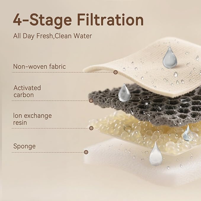 - 【Pure, Fresh Water in Every Sip】Our advanced vertical filtration system delivers cleaner, oxygen-rich water that pets love to drink. Here's how we keep water fresh and safe-1:Ion Exchange Resin – Removes heavy metals for healthier hydration,2:Activated Carbon Filter – Eliminates odors and bad tastes,3:Multi-Layer Filtration – Non-woven fabric + high-density sponge trap hair, debris, and impurities,4:Pump Protection – Reduces clogs and extends the fountain's lifespan