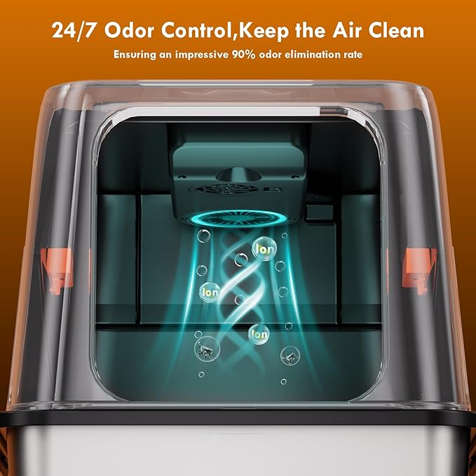 - Plasma Odor Control & Quiet IR Sensor: Advanced plasma technology neutralizes odors at a molecular level, paired with an adjustable 3 - speed fan to achieve 90% odor elimination—ideal for multi - cat homes. The built - in infrared sensor instantly pauses odor control fan when your cat approaches (preventing startling) and restarts 1 minute after they leave. Operating at ≤33dB, quieter than a library, it ensures undisturbed sleep for you and your cat day and night.