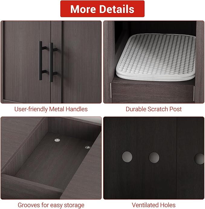 - Sophisticated design: Our double-cage cat litter cabinet features a carefully designed entrance hole in the middle section, allowing for easy access for your cats while promoting proper ventilation and lighting within the interior space. Additionally, the cabinet is constructed with waterproof materials, making it effortless to clean and maintain.