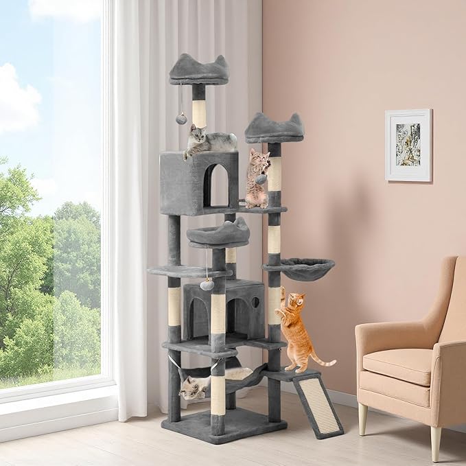 YITAHOME 75-Inch Tall Cat Tree Indoor: Multi-Level Kitten Tower with Kitty Condos, Top Perches, Sisal Ramp, Scratching Posts & Cozy Basket Hammocks Pet Play House Light Gray